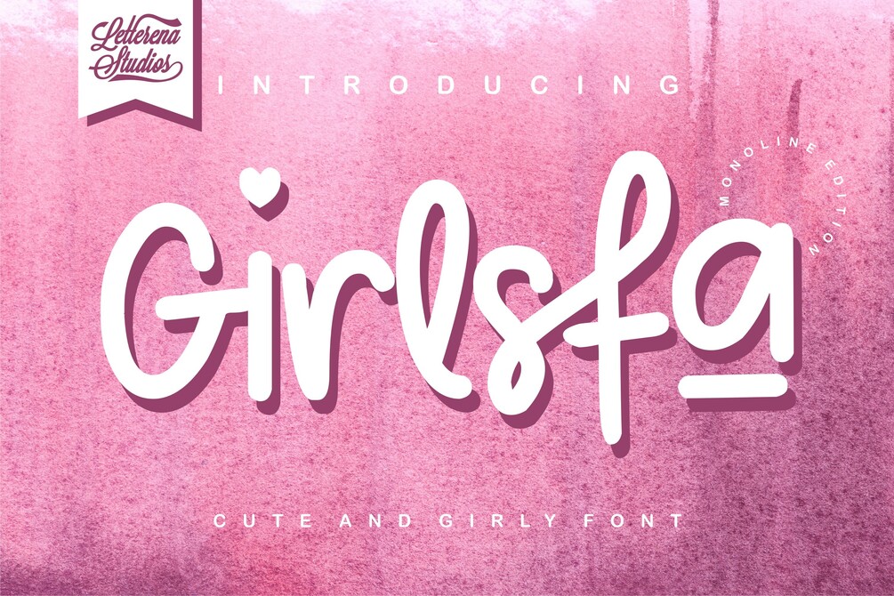 Girlsfa - Cute and Girly Font, from Letterena, is a cute signature calligraphy font, suitable for any projects such as: logos, branding projects, homeware designs, product packaging, mugs, quotes, posters, shopping bags, t-shirts, book covers, name card, invitation cards, greeting cards, label, photography, watermark, special events, and all your other lovely projects that need a beautiful calligraphy taste.